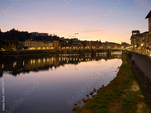 Obraz premium River Arno and Ponte Vecchio at dusk in Florence, Italy