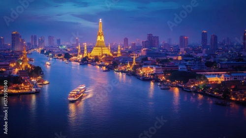 © songpol152, Fototapeta premium River cruise through bangkok's illuminated temples at dusk thailand landscape photography urban environment scenic view