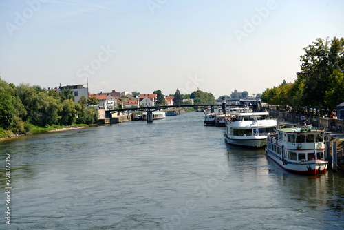 Fototapeta premium River Danube tour boats docked at Regensburg in Bavaria, Germany