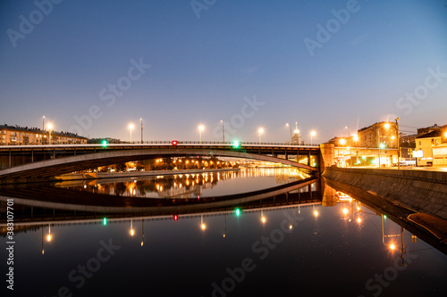 Fototapeta premium river embankment of a large metropolis at dawn with glowing lanterns reflections in the river