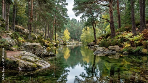 © Anna, Fototapeta premium River enclosed by dense forest on either bank and rocky landscape on the opposite side