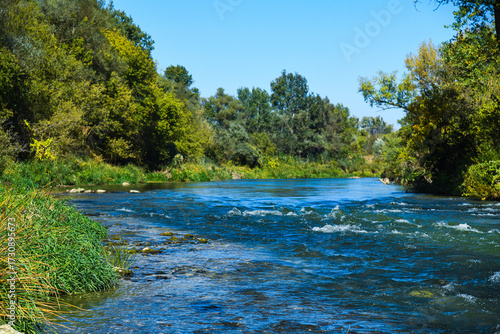 © SGr, Obraz premium River flowing through a lush green forest on a sunny summer day