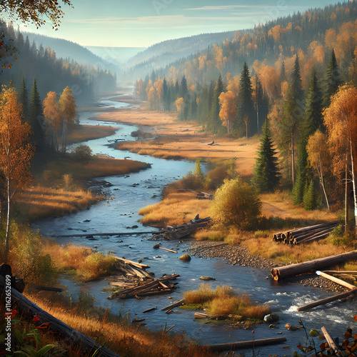 © Sergii, Obraz premium River flowing through autumn forest landscape with cut tree trunks