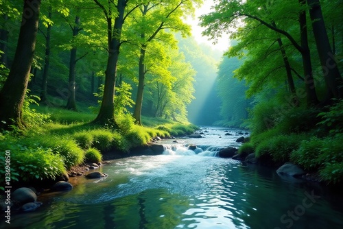 © Sarayuth, Obraz premium River flowing through lush forest of towering trees, trees, landscape, water