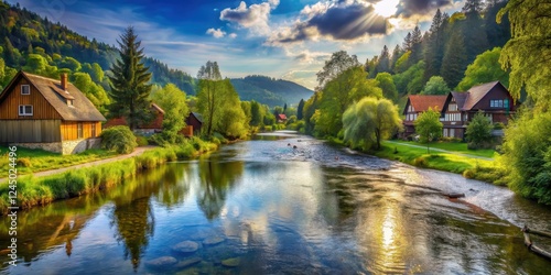 Fototapeta premium river flowing through village, serene river, forest surroundings