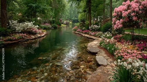© Ahmad-Muslimin, Obraz premium River flows through a lush green forest with vibrant flowers and clear water.