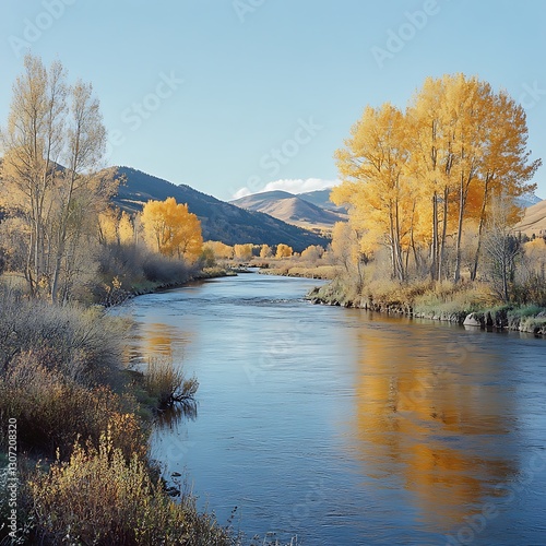 © Gaji, Fototapeta premium River flows through autumn trees, mountain view