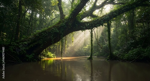 © Bujur Mujur, Obraz premium River Flows Through Lush Green Forest with Sunlight Streaming