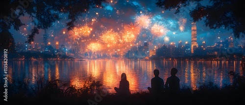 Naklejka premium River flows through the city, people sitting on the grass watching New Year's fireworks. Skyscrapers backdrop, creating peaceful, celebratory atmosphere. Perfect for New Year, city tourism marketing.