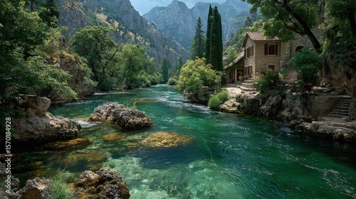 © amin11mario, Fototapeta premium River flows through valley