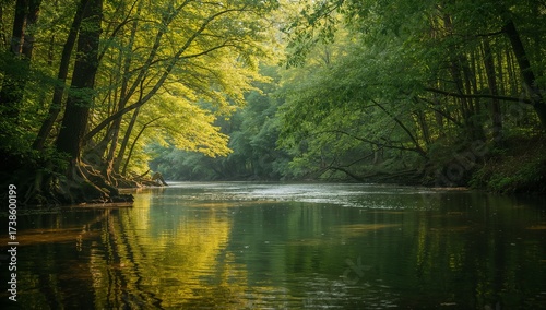 © Abdul Samad, Fototapeta premium River Forest Background with Sunlight Reflections