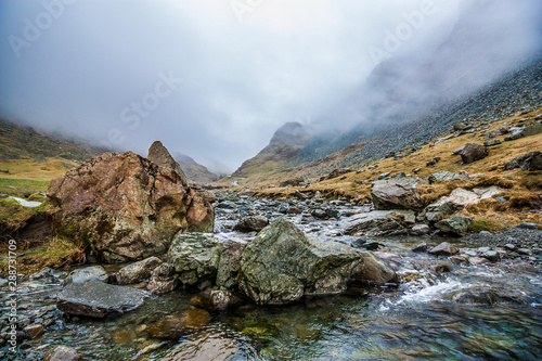© Renaud, Fototapeta premium River from Honister Pass on a Foggy Day, Lake District, UK, 2015