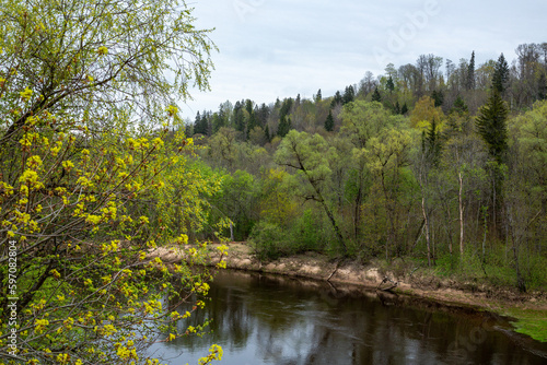 © Laura Kezbere, Obraz premium River Gauja in spring with first fresh leaves in Sigulda in Latvia