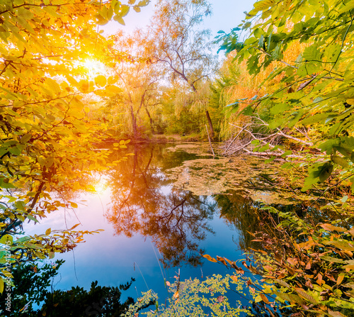 Obraz premium River in a delightful autumn forest at sunny day