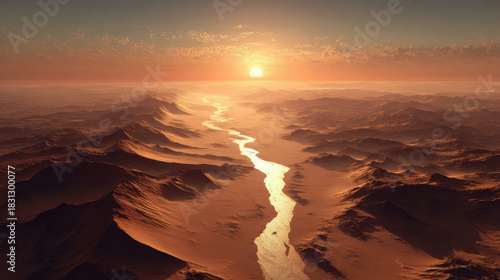 © scaliger, Obraz premium River in desert, breathtaking sunset over mars-like rocky landscape, water in sandy dunes