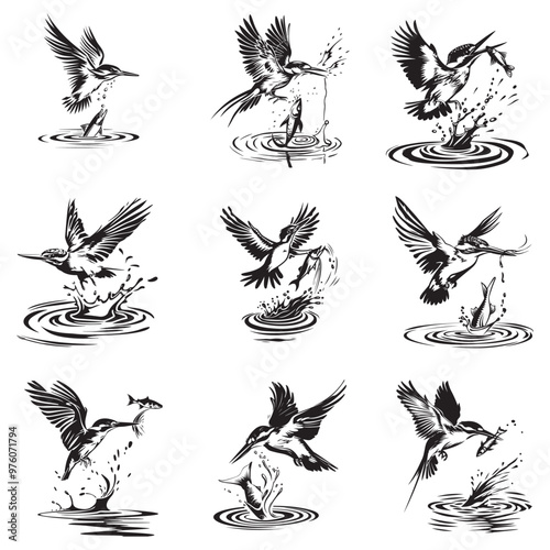 © Sadia, Fototapeta premium River Kingfisher Clipart Silhouette - Common Kingfisher Catching a fish Silhouette illustration in a White Background