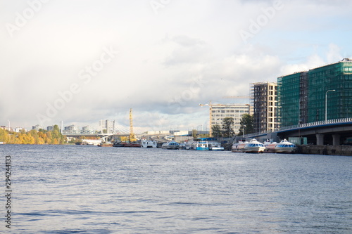 © Andrey, Naklejka premium River landscape with boats on a sunny day
