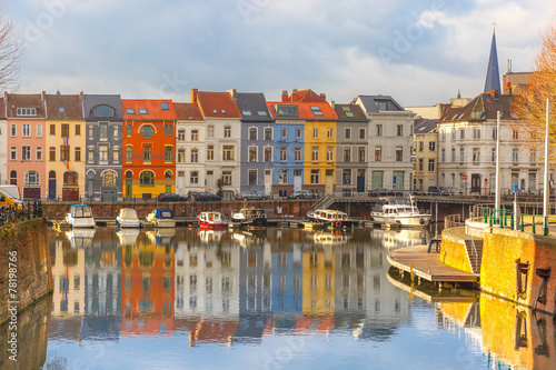 © Kavalenkava, Fototapeta premium River Leie, colored houses and Belfry tower in Ghent, Belgium