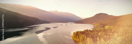 © vectorfusionart, Naklejka premium River passing through forest and mountains