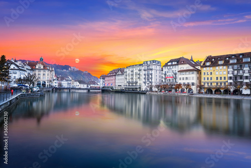 Fototapeta premium River Reuss side swiss city of Lucerne and twilight sunset