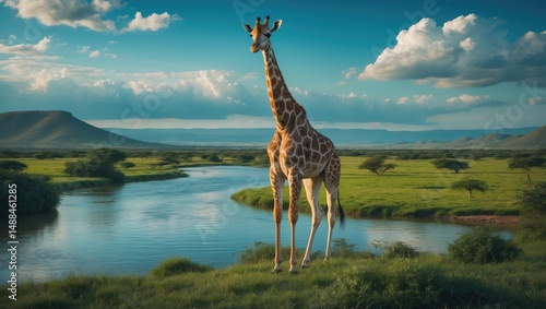© AIArtistry, Obraz premium River scene in Africa with a giraffe