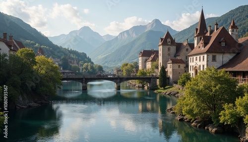 Obraz premium River valley with old town and stone bridge, scenic historical landscape