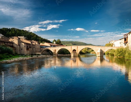© Mckenzie, Fototapeta premium river view with stone bridge and town