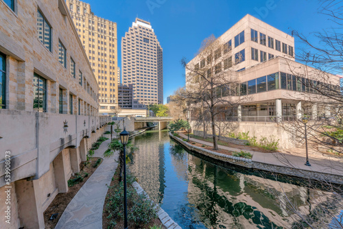 Naklejka premium River Walk in San Antonio Texas along tall buildigs with blue sky background