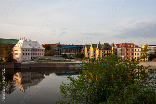 Naklejka premium river, water, architecture, city, lake, reflection, house, europe, sky, travel, landscape, building, town, italy, view, blue, old, houses, village, bridge, urban, church, castle, pond, tourism,wroclaw