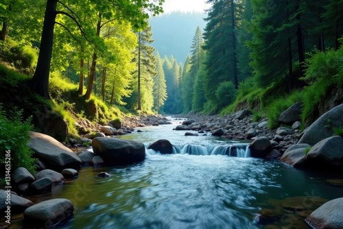 Obraz premium River water flowing through a narrow forest canyon, natural scenery, canyon...
