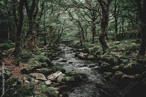 © ahmad, Obraz premium River winds through lush, mossy forest under dark, tangled trees