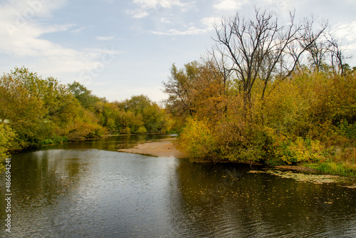 © Aritel, Fototapeta premium River with autumn trees along the banks. Beautiful horizontal landscape