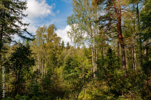 Obraz premium River with brown transparent water in a dense forest on a sunny summer day