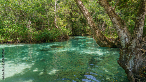 Naklejka premium River with crystal clear turquoise water. Tropical river with mangroves.