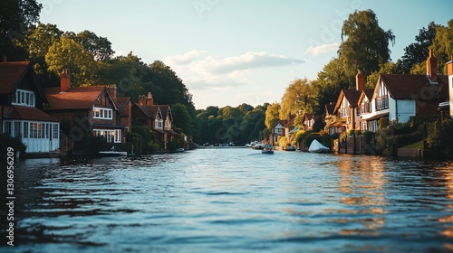 © rashyn, Fototapeta premium River with houses along edges, boats move through, suitable for travel content