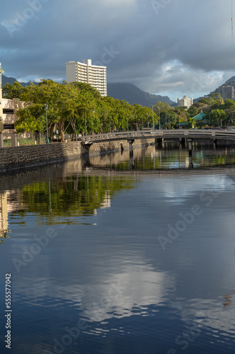 © ttrimmer, Obraz premium River with Reflections and a Bridge.