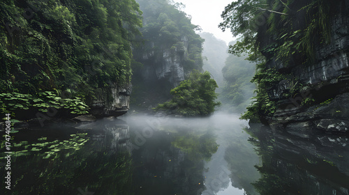 Obraz premium RiverAmidstLushCliffsWithMist
