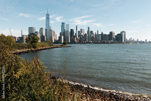 Obraz premium riverbank of Hudson river with skyscrapers of Manhattan in New York City.