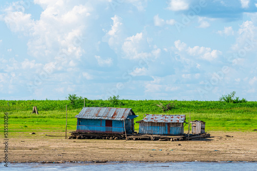 © jon_chica, Fototapeta premium riverbank view of peruvian amazon with shanty houses at background