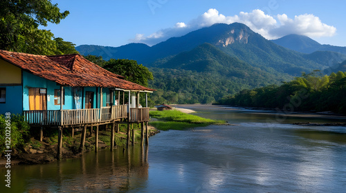 Naklejka premium Riverfront house, mountain backdrop, tranquil scene, travel destination