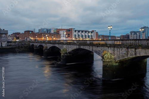 Naklejka premium Riverside area at night. Shannon river, Limerick city, Ireland. Blue and orange colors. Dusk scene. Cloudy sky. Christmas and New Year illumination.