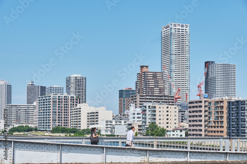 © Namsun, Obraz premium Riverside City Skyline Panorama with Bridge Railing