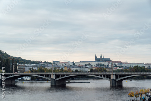 Naklejka premium Riverside scenery in Prague, Czech Republic with Prague Castle, bridges and buildings
