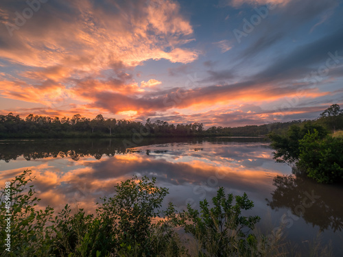 Obraz premium Riverside Sunrise with Beautiful Cloud Reflections