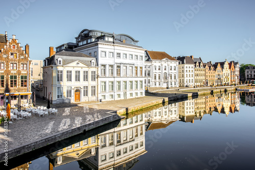 Obraz premium Riverside view with beautiful old buildings and water channel during the morning light in Gent city, Belgium
