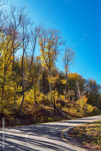 © Vastram, Fototapeta premium Road among yellow autumn mountain forest