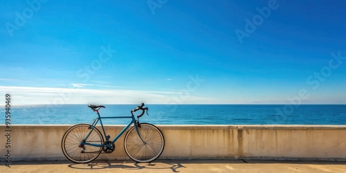© Collection, Fototapeta premium Road bicycle parked against a wall by the seaside with a clear blue sky backdrop, road bicycle, wall, seaside