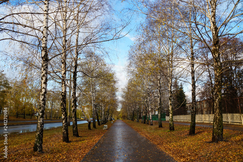 Fototapeta premium road, birch, alley, rain, sky, clouds, autumn