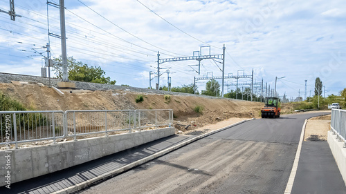 Naklejka premium Road construction near railway tracks highlighting infrastructure development...