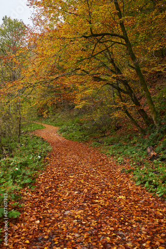 © Xalanx, Fototapeta premium Road covered with fallen leaves in the forest